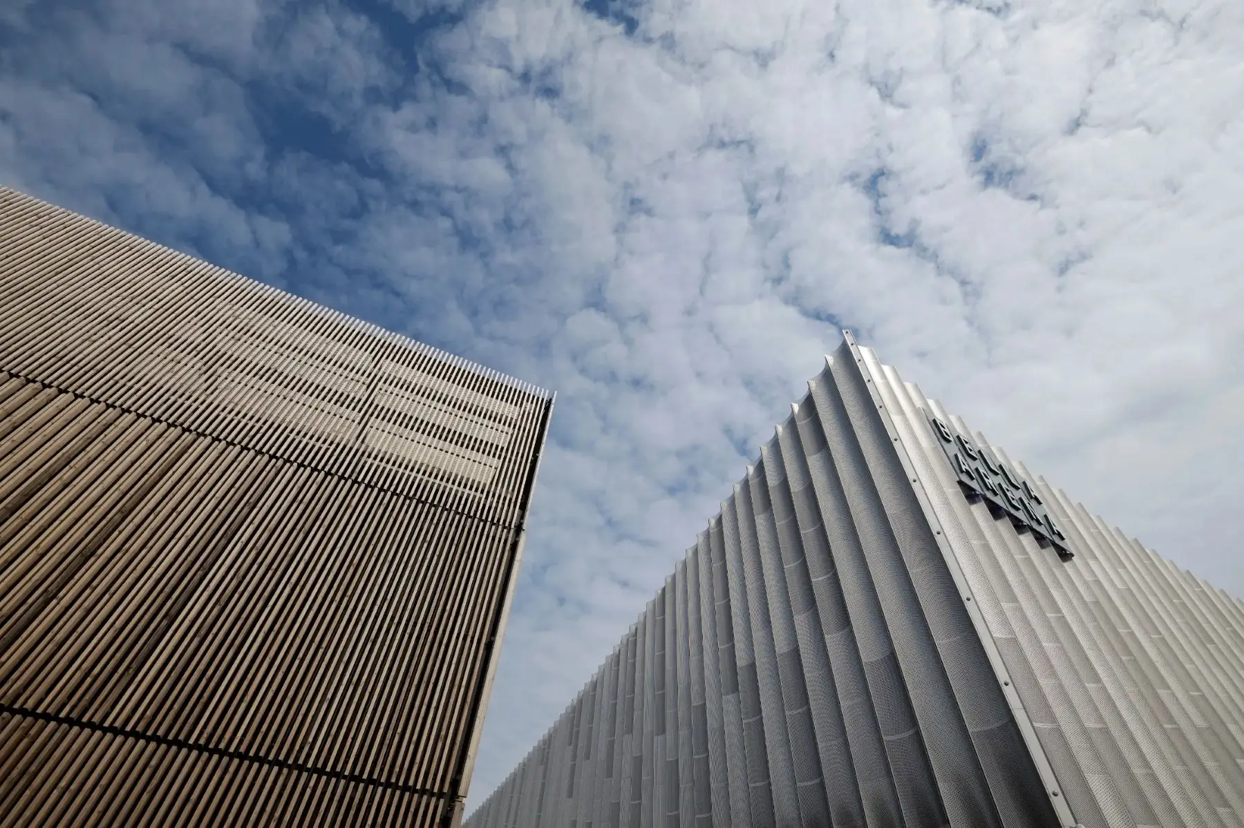 Bella Center's Resource Building is a presentable and sustainable example of this. Here, Woodfac Click is installed with wooden lamellae in sizes 34x34mm and 34x85mm and a c.t.c distance of 79.5mm.