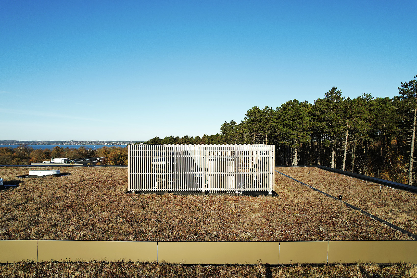 Nordisk Profil har bidraget med klimaskærme i thermoask og leveret vores lukkede facadesystem Woodfac Panel til vinduespartierne. Lamellerne er udført i dimensionen 34x34 mm og monteret med en cc-afstand på 70 mm – men designet kan tilpasses fuldstændigt efter ønske med valgfri afstand og længde.